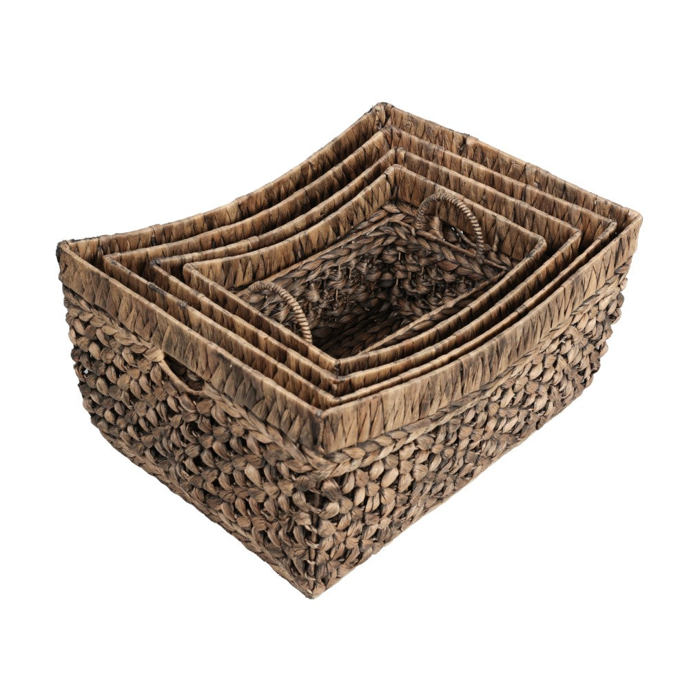This five-piece basket set blends the natural texture of handwoven water hyacinth with the stability of a reinforced metal frame. Open-weave construction adds an airy look while keeping contents visible and accessible. Designed for versatile use, these baskets offer both stylish organization and durable function throughout the home.