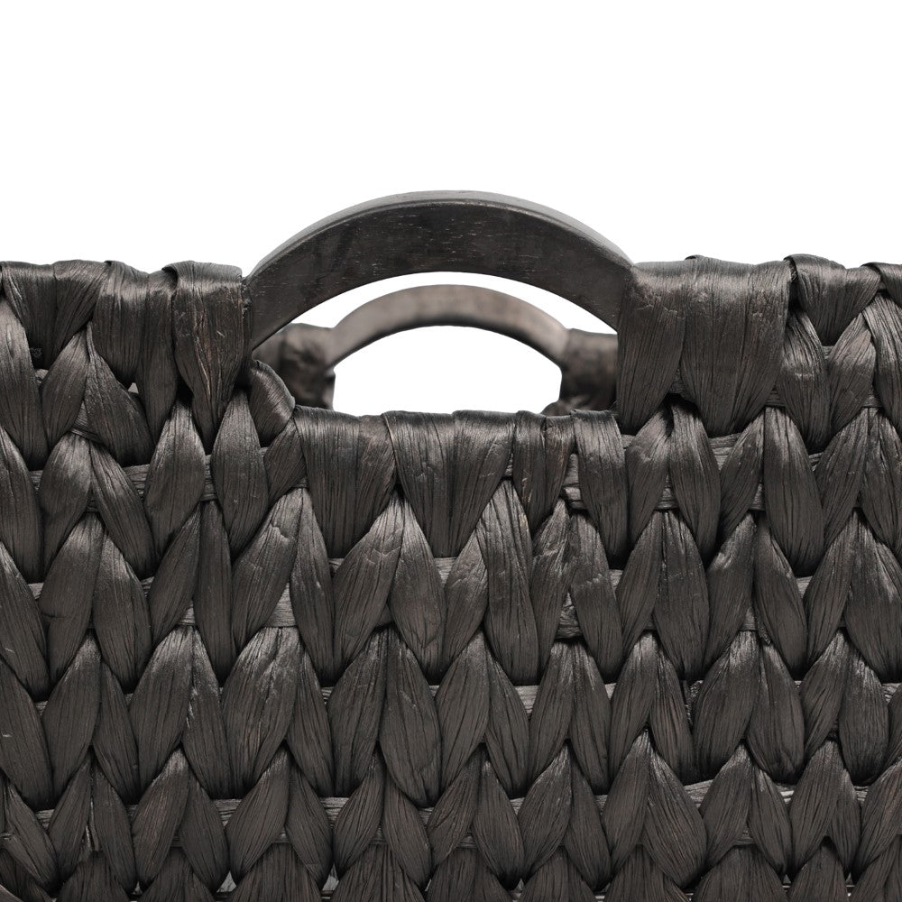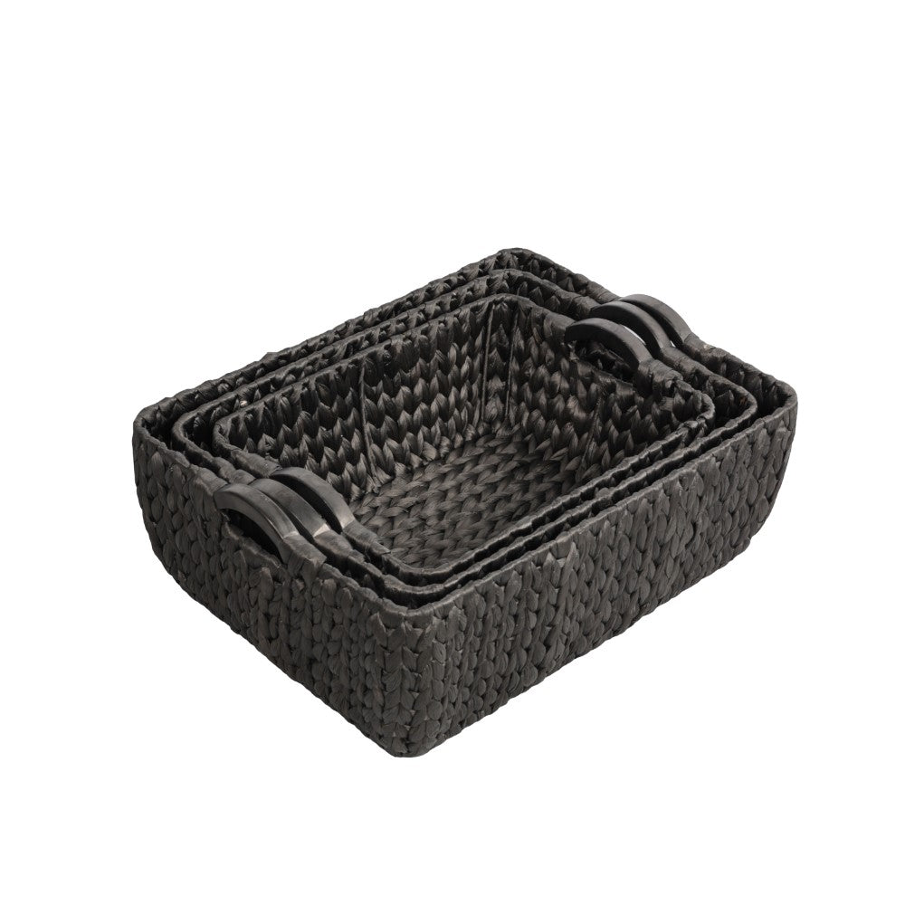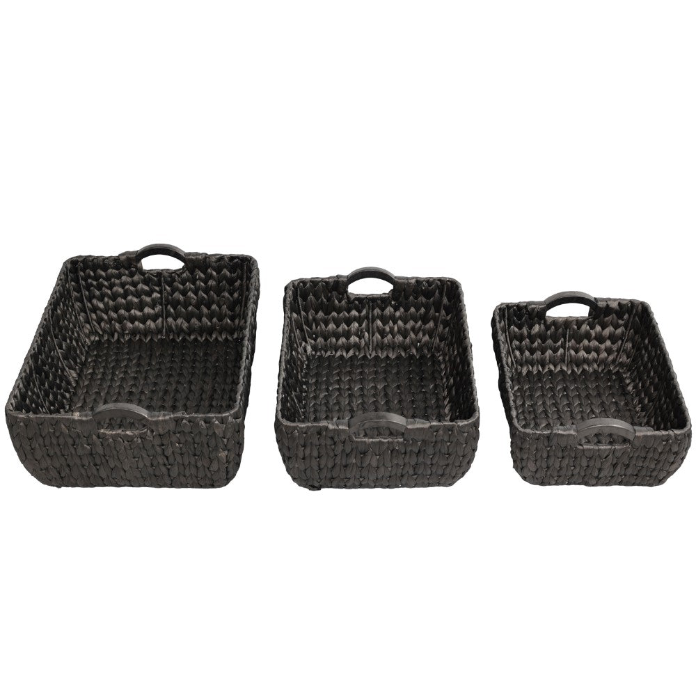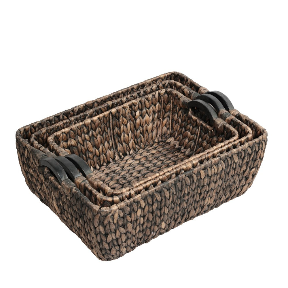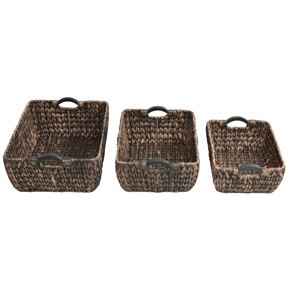 This set of baskets combines natural water hyacinth with a sturdy metal frame for durability and structure. Each piece is enhanced with prominent wood handles that provide a strong grip and add a crafted accent. Designed for versatile storage, these baskets bring both functionality and decorative appeal to any space.