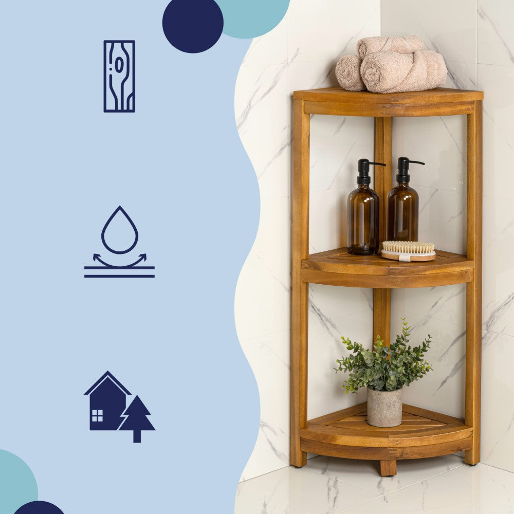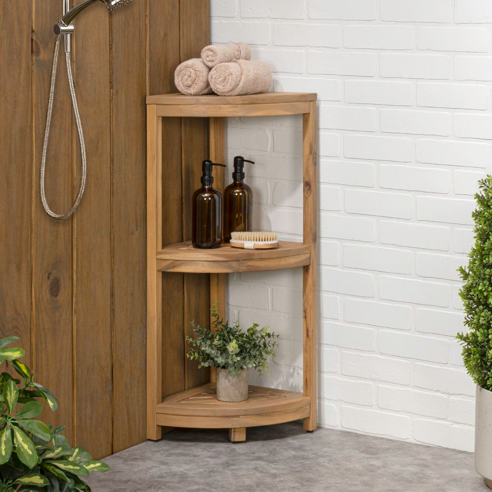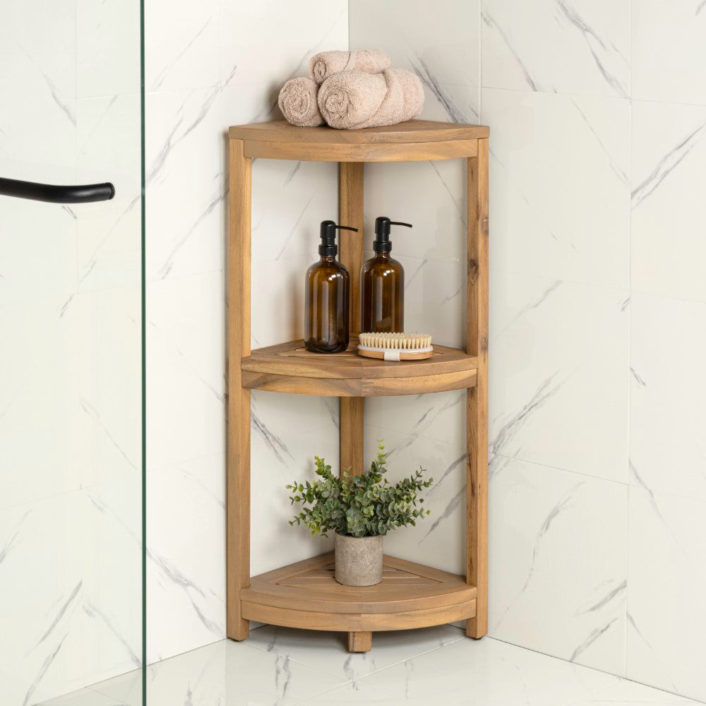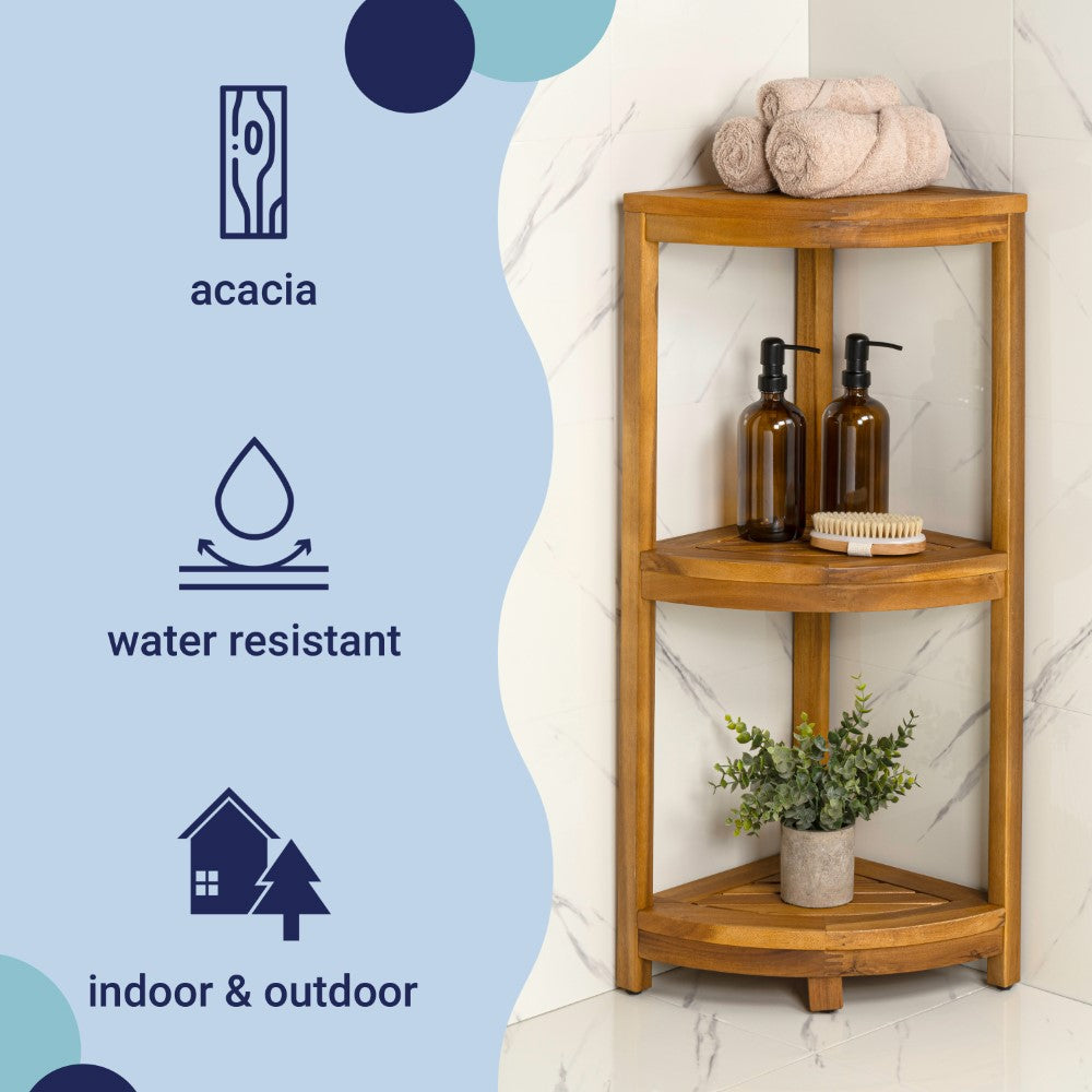 This classic 3-tier shelf fits easily into any corner, adding storage to small spaces. The quarter-round design is made from water-resistant acacia wood with a protective oil finish. Set this minimalist shelf in the shower, beside the tub, or use it as a plant stand indoors or outdoors.